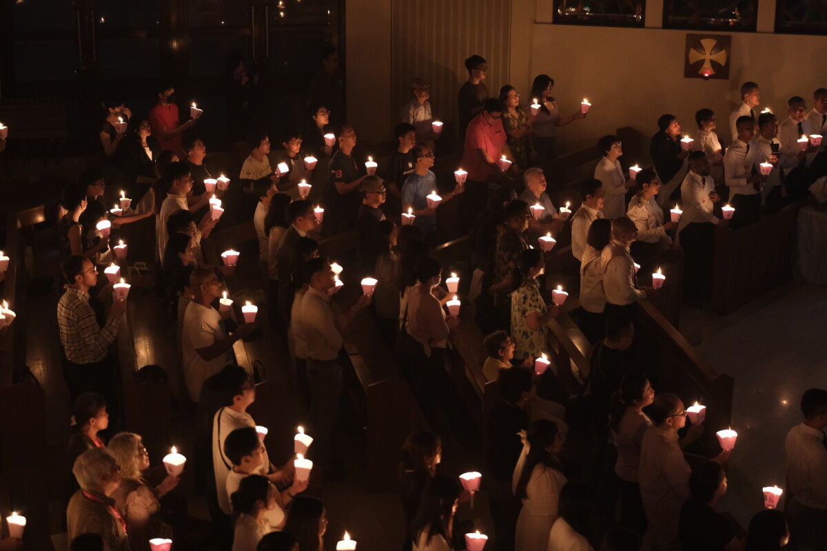 Finally, the liturgy reaches its summit in the Eucharist, in which the Risen Lord feeds His people with His Body and Blood. The entire Vigil takes place at night, beginning after nightfall and ending before the dawn of Sunday, so that the Church may pass in vigil with her Lord from the darkness of death into the light of Easter day.