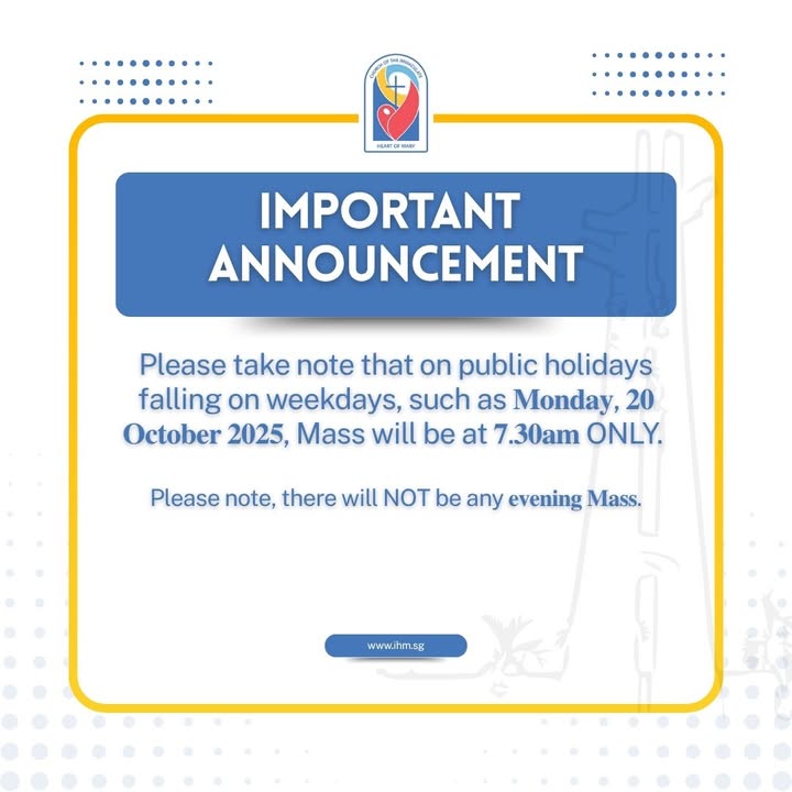Please take note that on public holidays falling on weekdays, such as 𝐌𝐨𝐧𝐝𝐚𝐲, 𝟐𝟎 𝐎𝐜𝐭𝐨𝐛𝐞𝐫 𝟐𝟎𝟐𝟓, Mass will be at 𝟕.𝟑𝟎𝐚𝐦 ONLY. 🌞