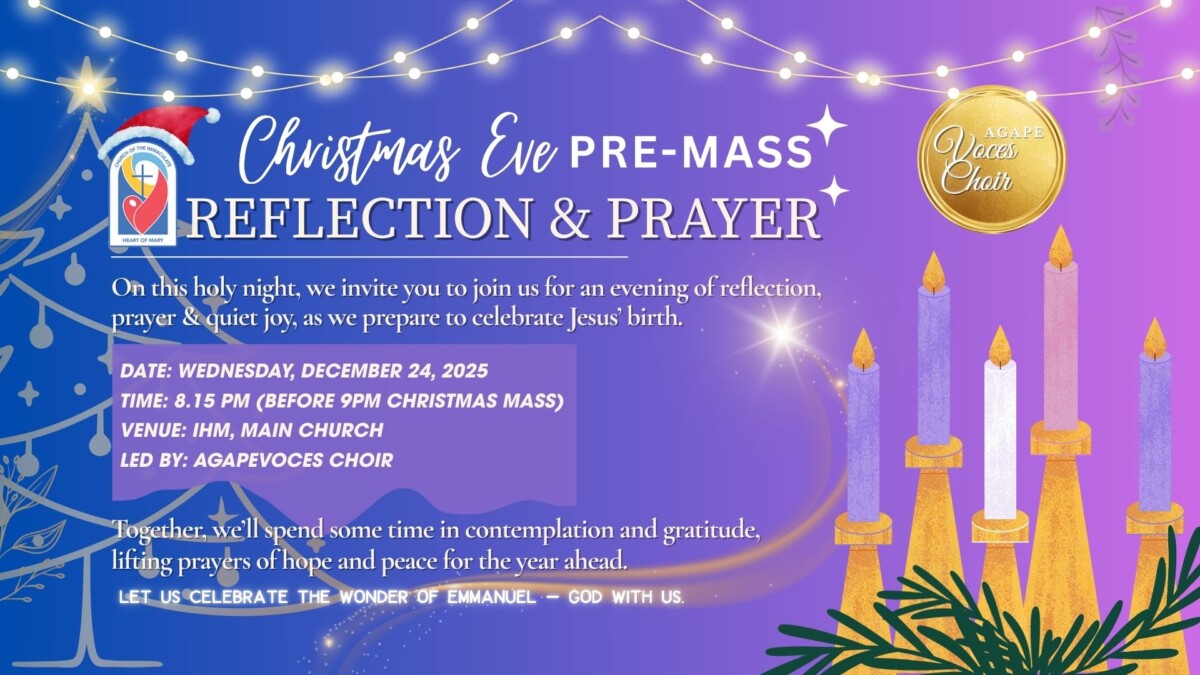 On this holy night, Wednesday, 24 December 2025, come by IHM Main Church at 𝟖.𝟏𝟓 𝐩𝐦 for a quiet Christmas Eve reflection and prayer before the 9 pm Mass, step away from the rush and let Emmanuel, God with us, fill your night with peace.